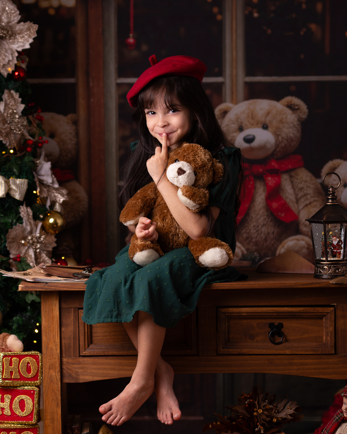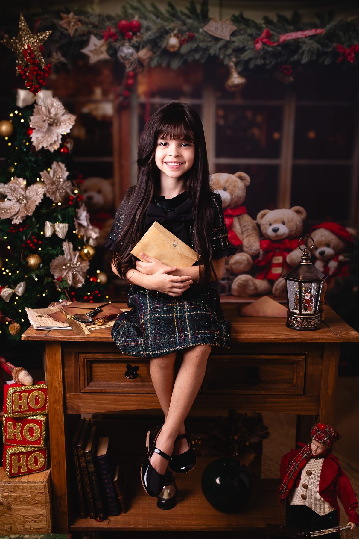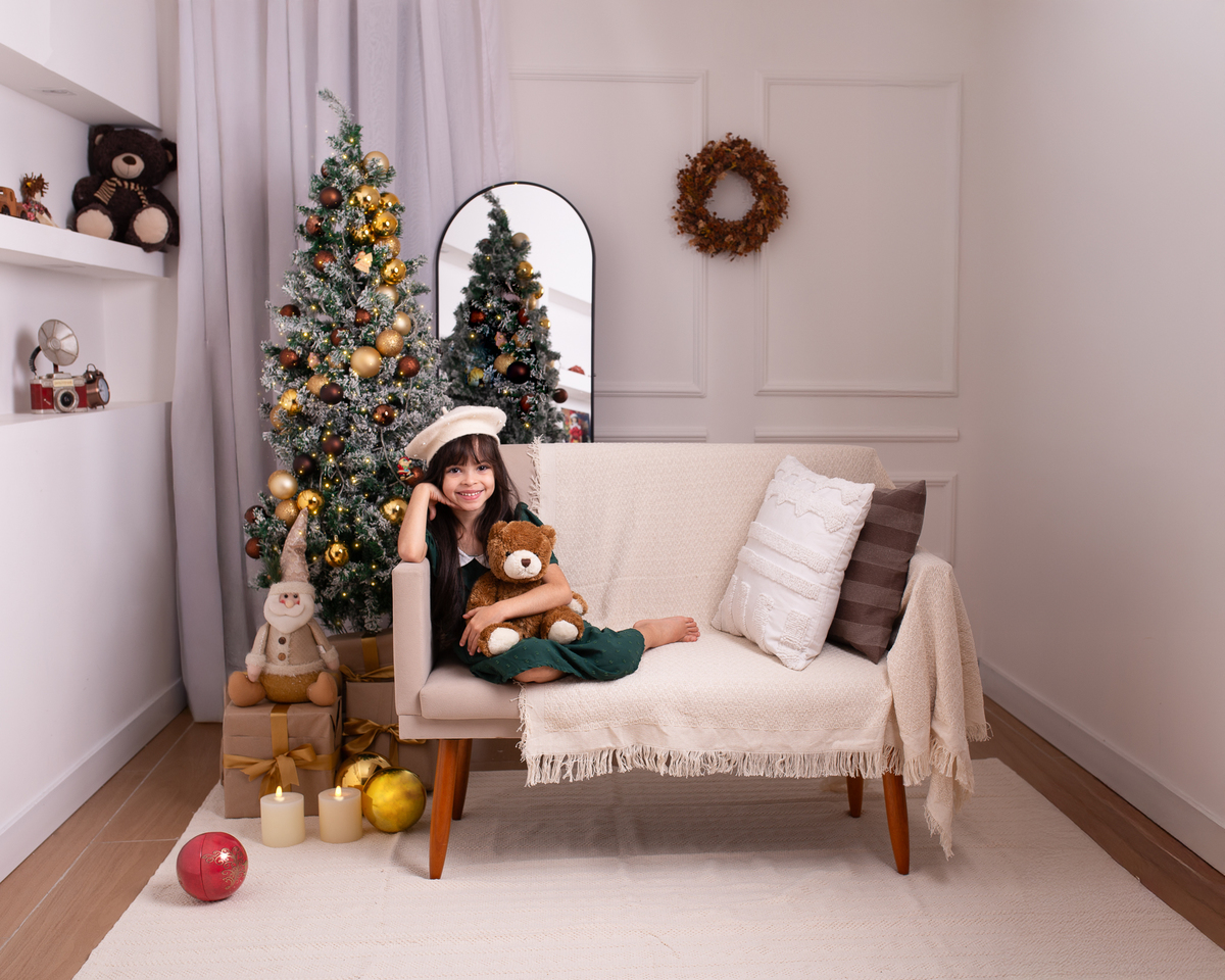 Hoje no nosso estúdio temos 4 cenários; sendo um com neve, outro bem tradicional com tonalidade vermelho e verde, uma sala clean, e a novidade deste ano são os ensaios artísticos.